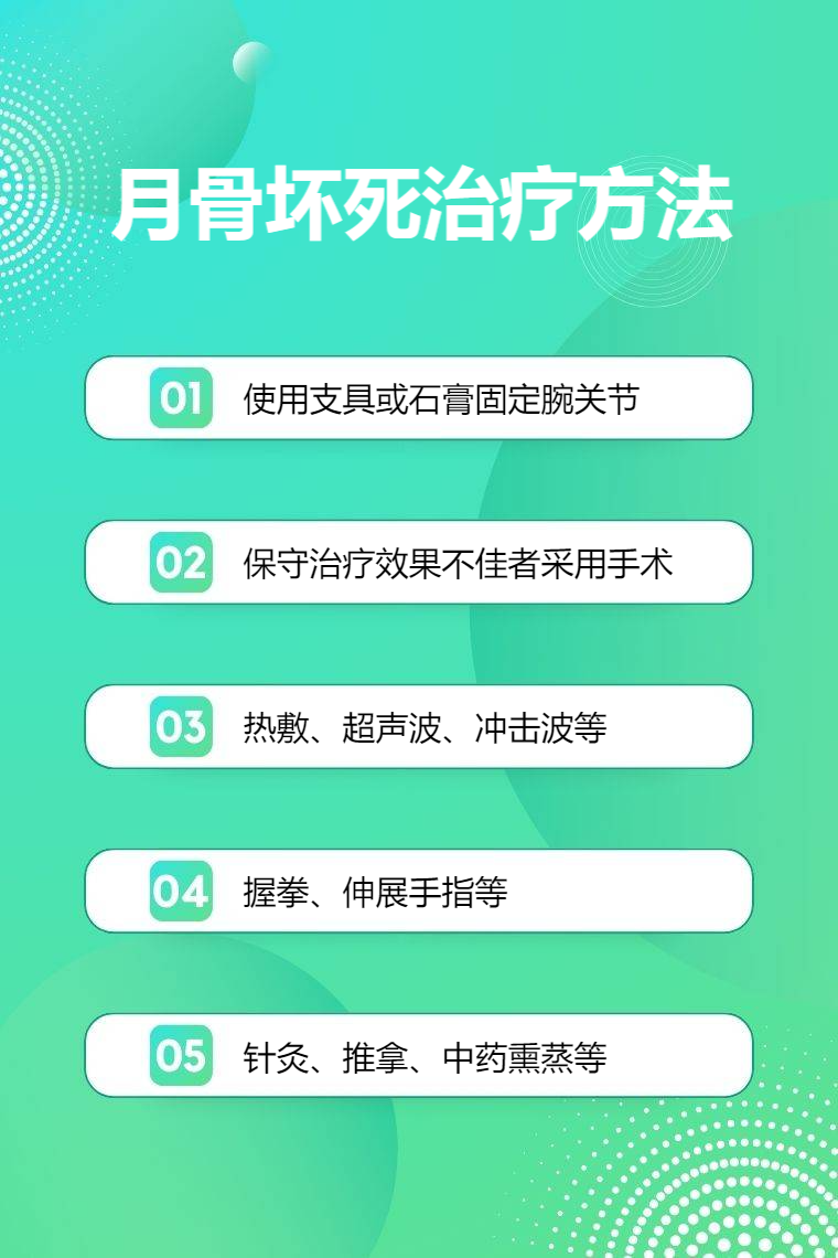 月骨坏死的治疗方法有保守治疗、手术治疗、物理治疗、康复训练、中医治疗等。