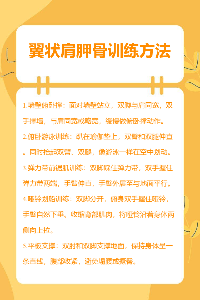 翼状肩胛骨训练方法有墙壁俯卧撑、俯卧游泳训练、弹力带前锯肌训练、哑铃划船训练、平板支撑等。