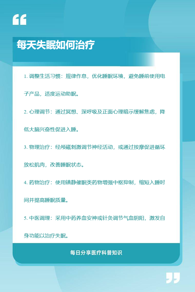 每天失眠可通过调整生活习惯、心理调节、物理治疗、药物治疗、中医调理等方法进行治疗。