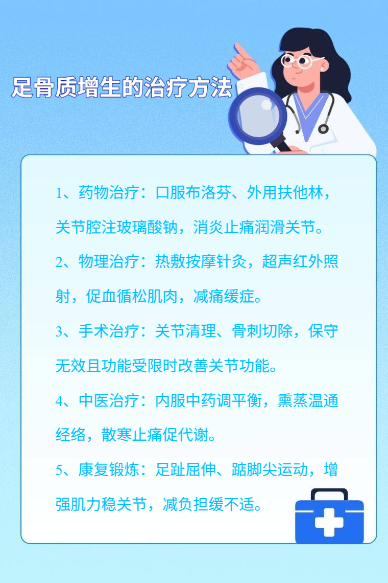 足骨质增生的治疗方法有药物治疗、物理治疗、手术治疗、中医治疗、康复锻炼等。