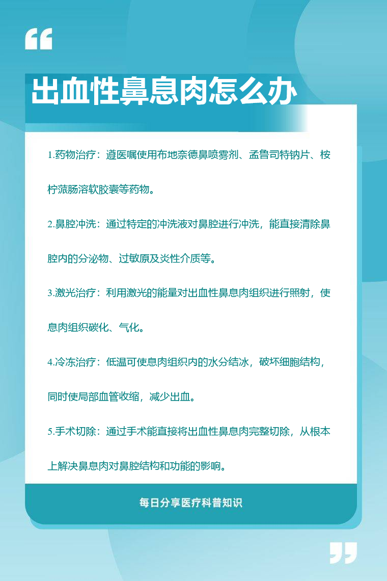 出血性鼻息肉可通过药物治疗、鼻腔冲洗、激光治疗、冷冻治疗、手术切除等方法处理。