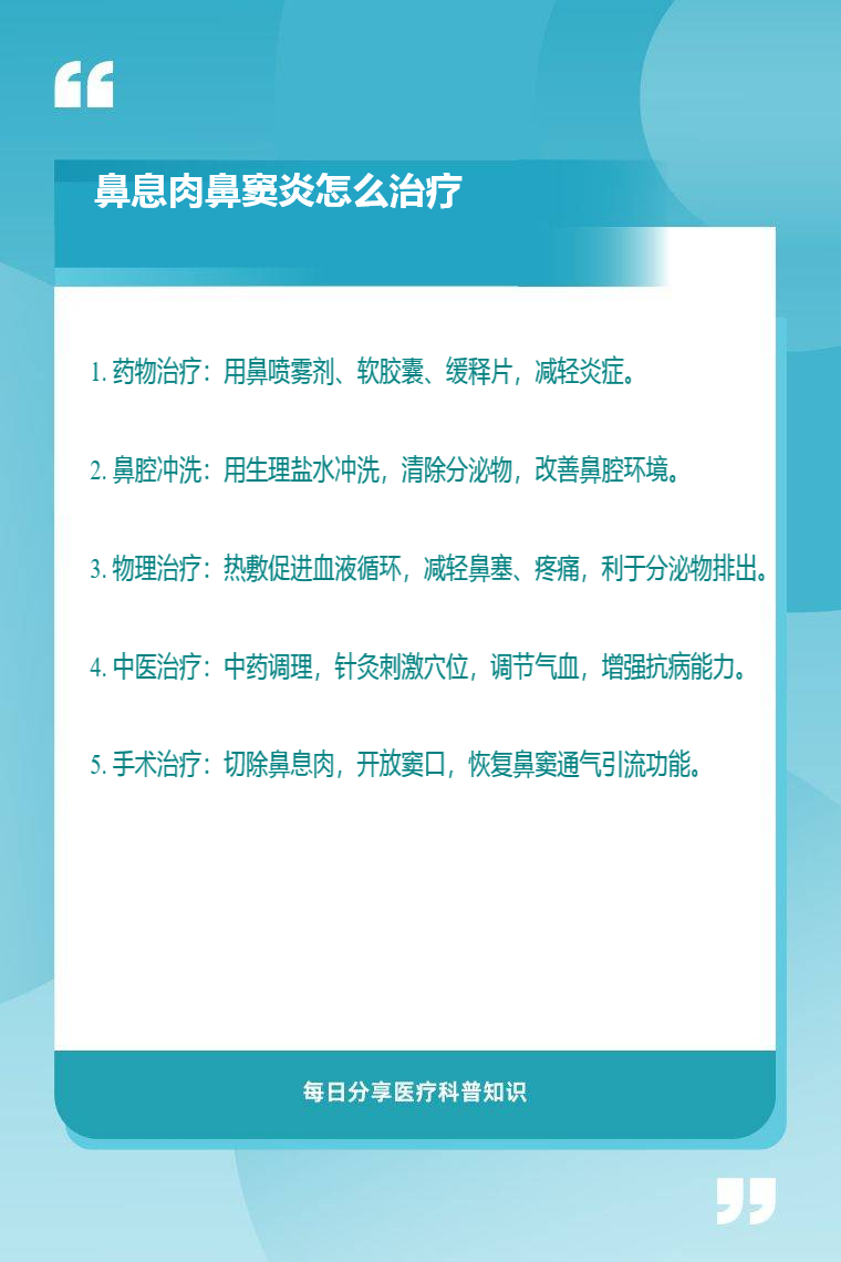 鼻息肉鼻窦炎的治疗方法有药物治疗、鼻腔冲洗、物理治疗、中医治疗、手术治疗等。
