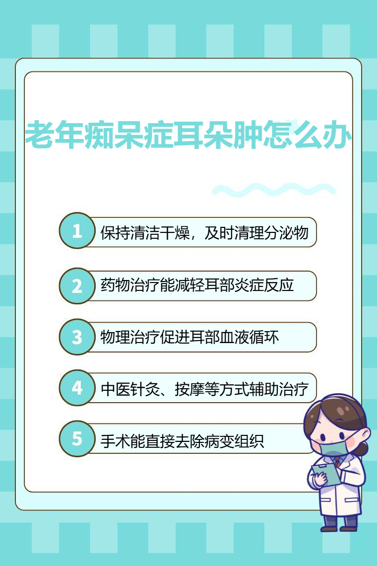 老年痴呆症患者耳朵肿可通过一般护理、药物治疗、物理治疗、中医调理、手术治疗等方法应对。