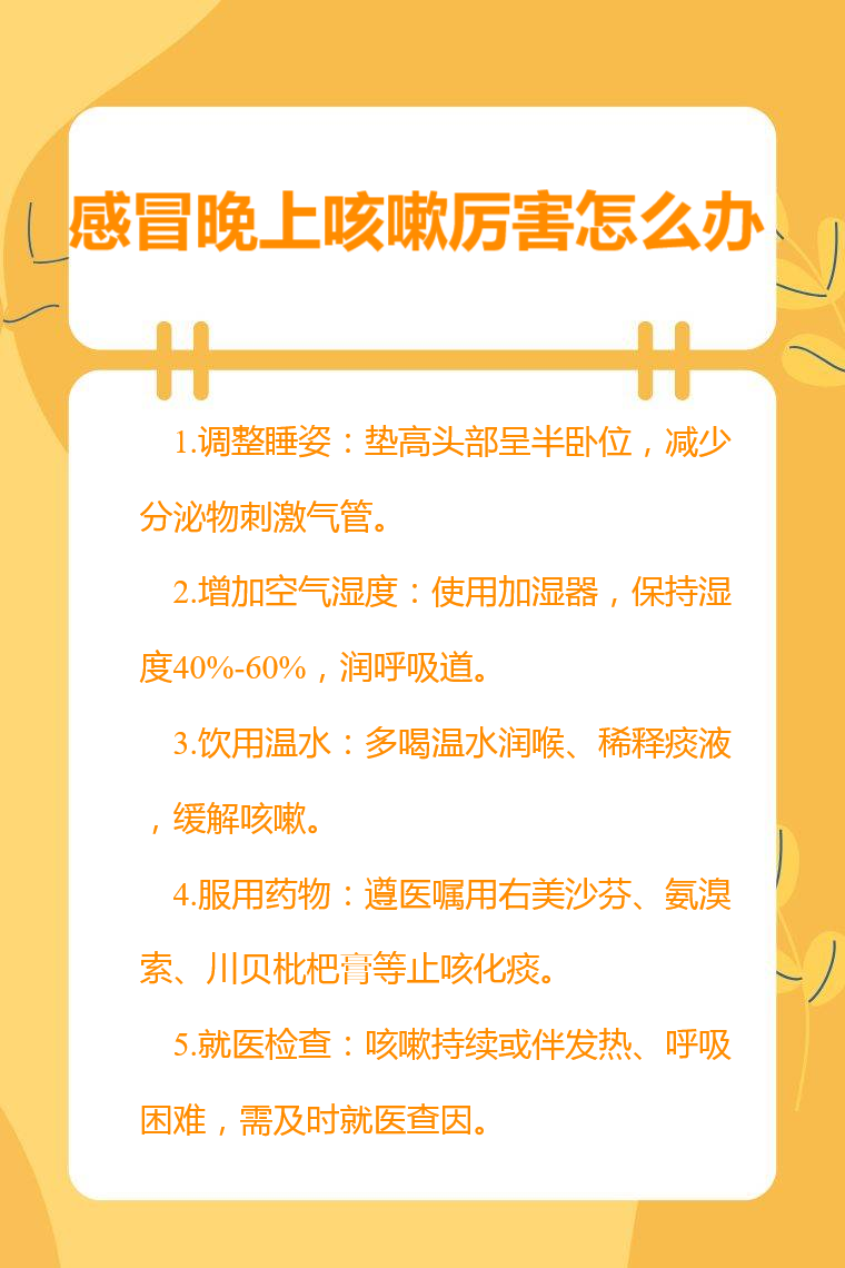 感冒晚上咳嗽厉害可通过调整睡姿、增加空气湿度、饮用温水、服用药物、就医检查等方法缓解。