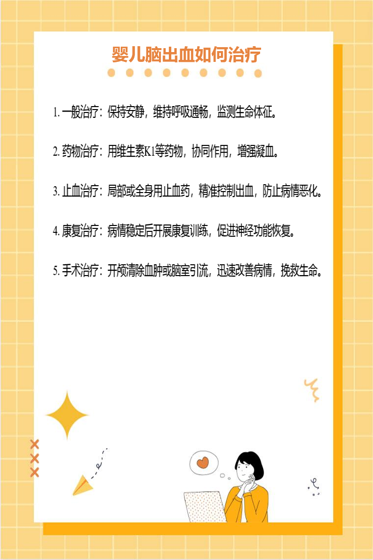 婴儿脑出血的治疗方法主要有一般治疗、药物治疗、止血治疗、康复治疗、手术治疗等。