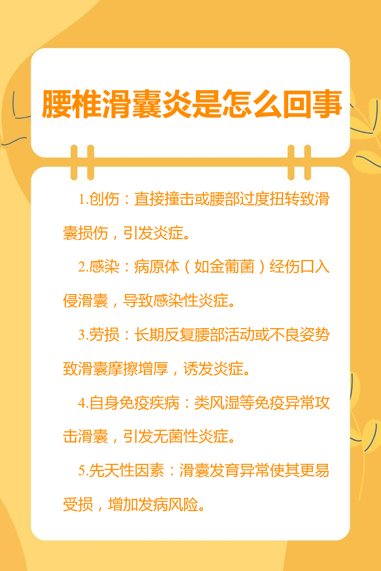 4. 自身免疫疾病:当身体出现类风湿关节炎等自身免疫疾病时,免疫系统会错误地攻击自身组织,腰椎滑囊也可能成为被攻击的对象,引发无菌性炎症,形成滑囊炎。