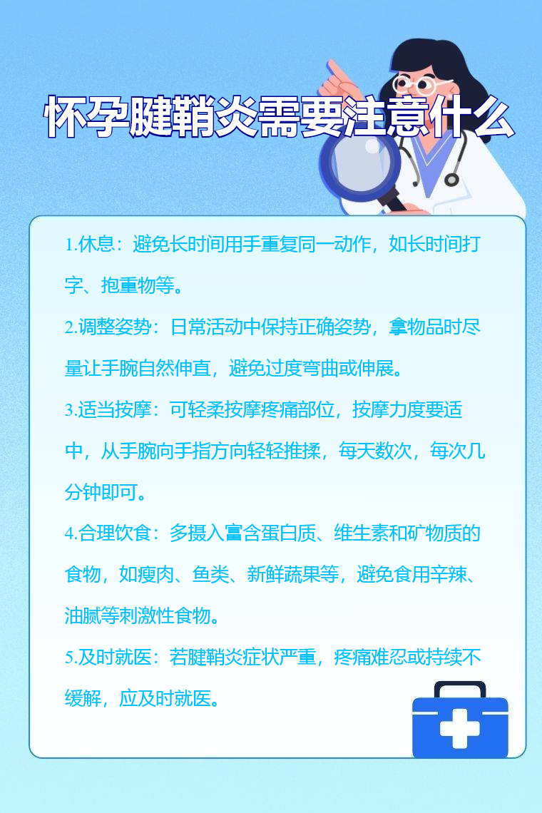 怀孕期间孕妇腱鞘炎需要注意休息、调整姿势、适当按摩、合理饮食、及时就医等。