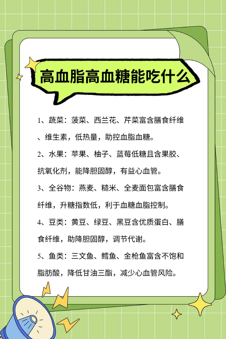高血脂高血糖能吃的食物有蔬菜、水果、全谷物、豆类、鱼类等。