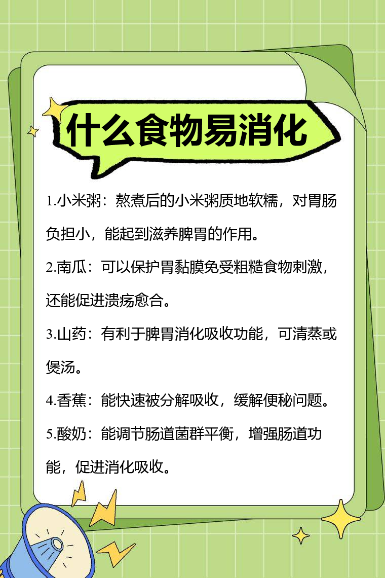 小米粥、南瓜、山药、香蕉、酸奶等是易消化的食物。
