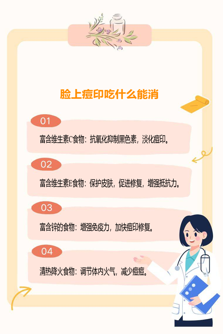 富含维生素C的食物、富含维生素E的食物、富含锌的食物、具有清热降火功效的食物等对消除脸上痘印可能有帮助。