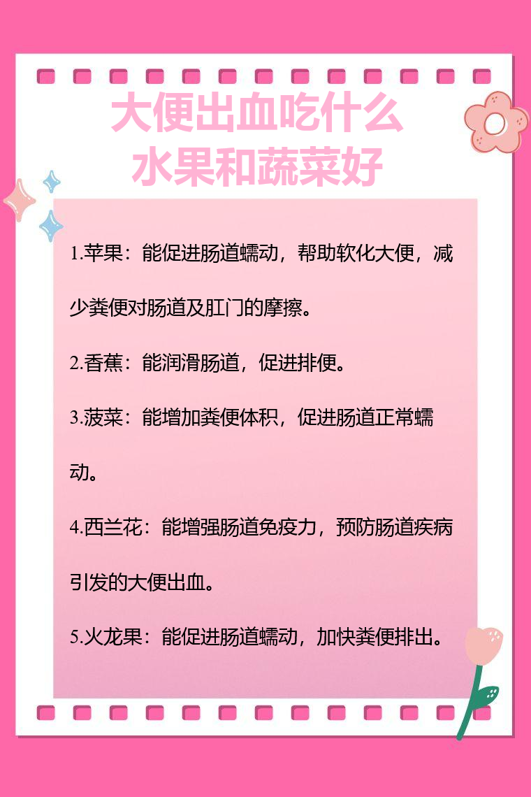 1.苹果:富含果胶,这是一种水溶性膳食纤维,能促进肠道蠕动,帮助软化大便,减少粪便对肠道及肛门的摩擦,从而在一定程度上缓解因大便干结等导致的出血情况,且苹果四季常见,食用方便。