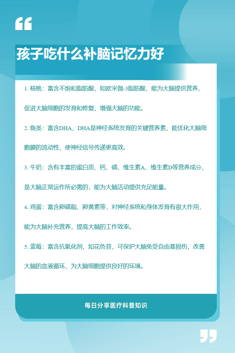 核桃、鱼类、牛奶、鸡蛋、蓝莓等食物对孩子补脑提高记忆力有益。