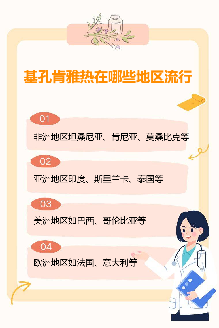 基孔肯雅热在非洲、亚洲、美洲、欧洲等地区流行。
