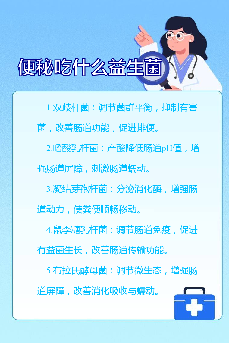 双歧杆菌、嗜酸乳杆菌、凝结芽孢杆菌、鼠李糖乳杆菌、布拉氏酵母菌等可用于缓解便秘。