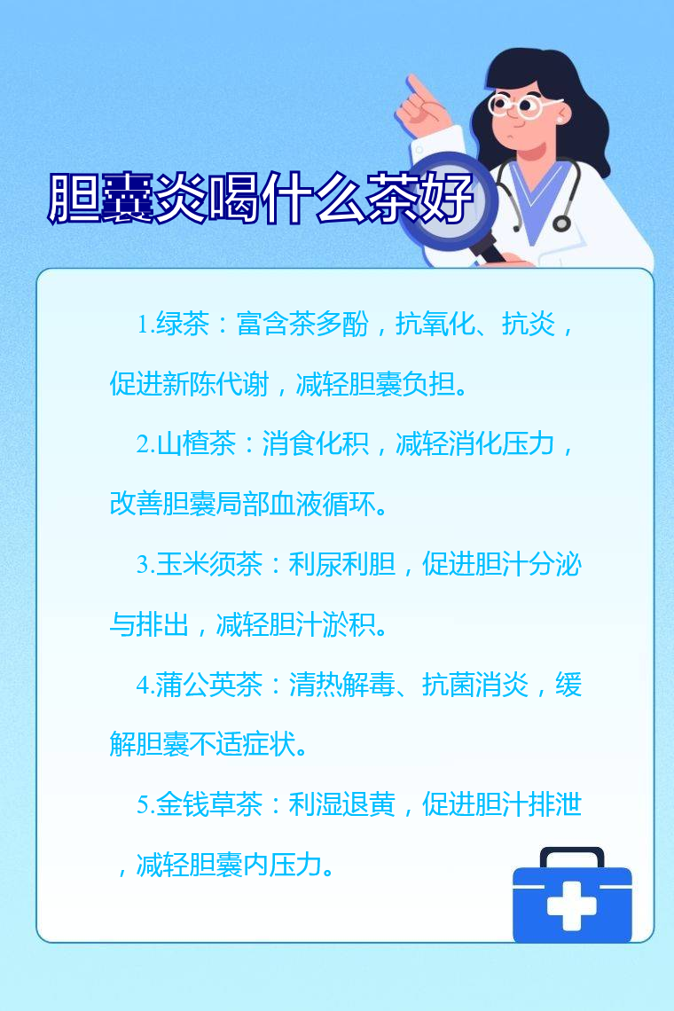 胆囊炎患者可选择喝绿茶、山楂茶、玉米须茶、蒲公英茶、金钱草茶等。