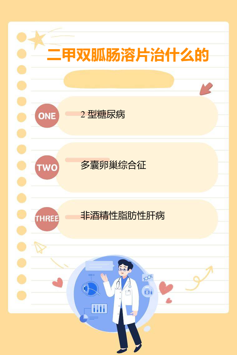 二甲双胍肠溶片可用于治疗 2 型糖尿病、多囊卵巢综合征、非酒精性脂肪性肝病等。