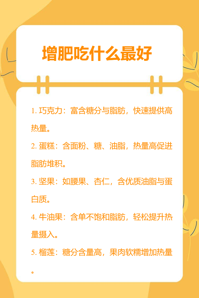 1. 巧克力:富含大量糖分与脂肪,一小块巧克力就能提供较高热量,在两餐之间适当食用,能有效增加每日热量摄入,助力体重上升。