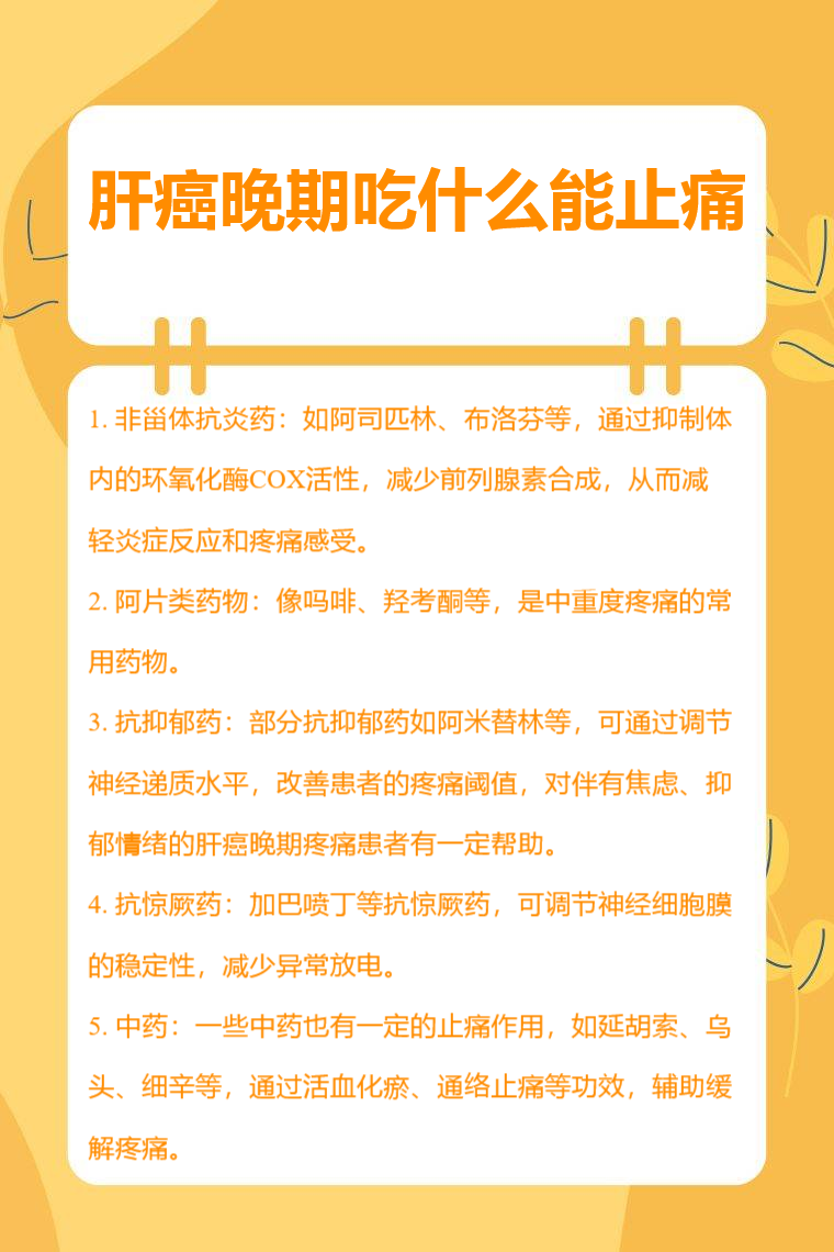 肝癌晚期可通过服用非甾体抗炎药、阿片类药物、抗抑郁药、抗惊厥药、中药等缓解疼痛。