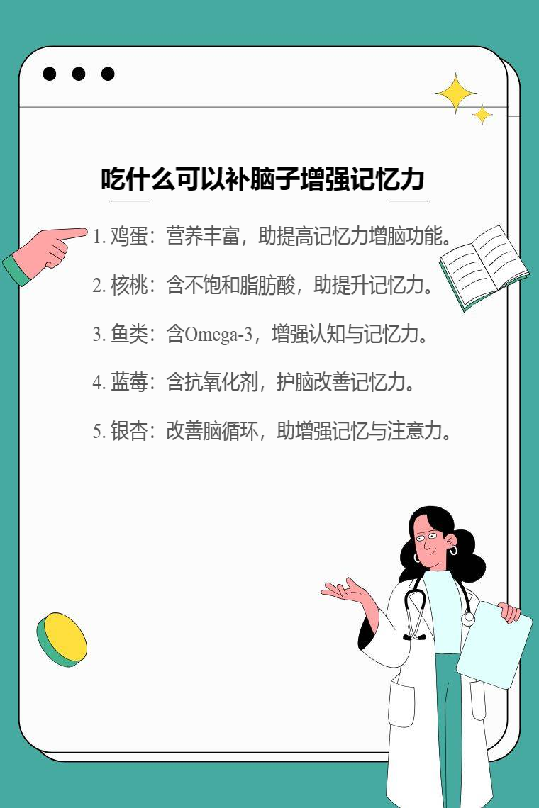 食用鸡蛋、核桃、鱼类、蓝莓、银杏等可补脑子增强记忆力。