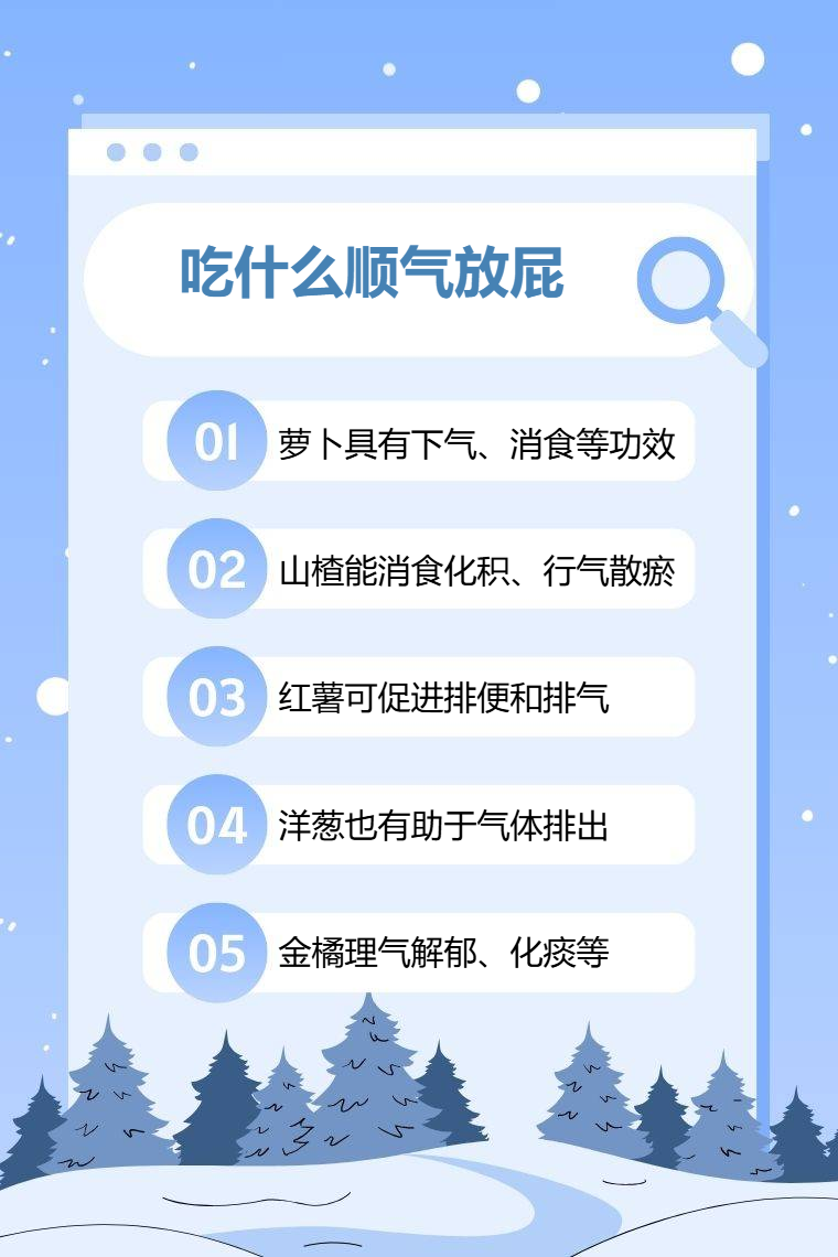 萝卜、山楂、红薯、洋葱、金橘等可帮助顺气放屁。