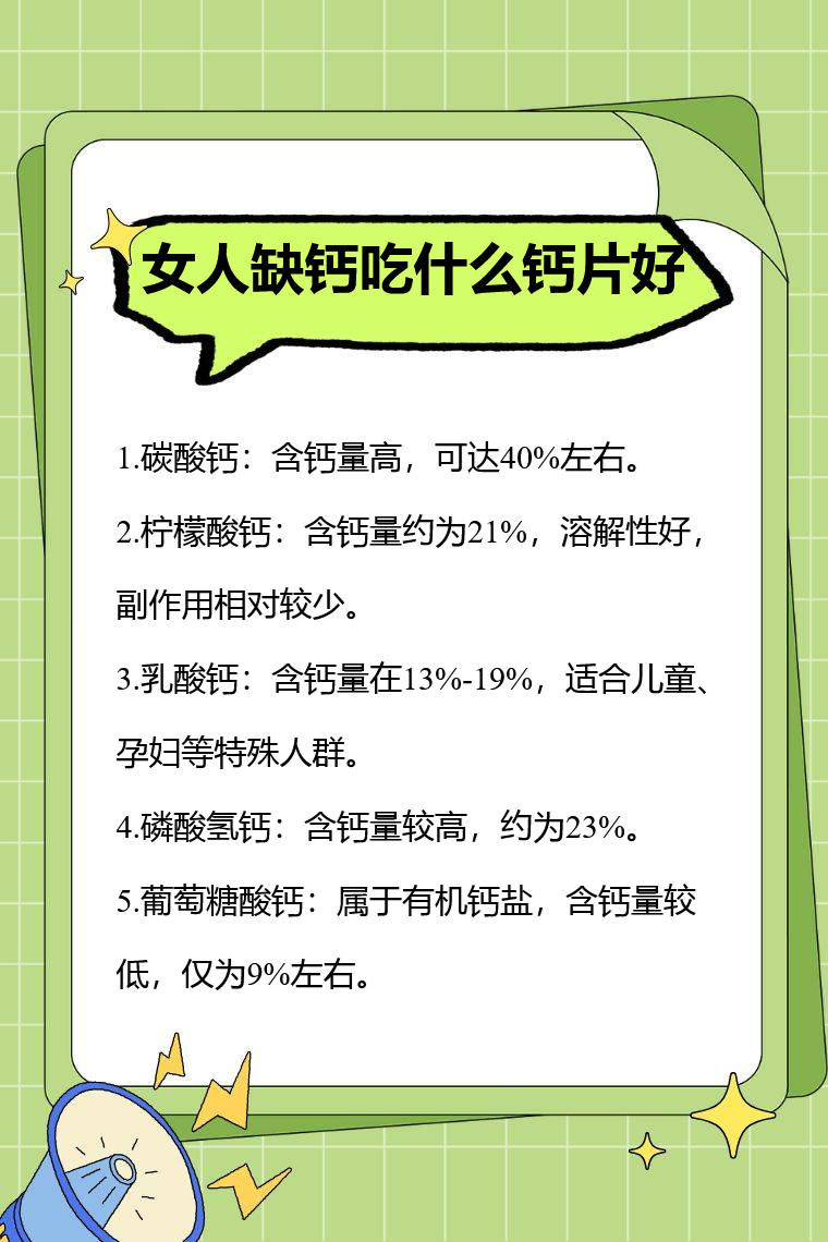 女人缺钙时一般吃碳酸钙、柠檬酸钙、乳酸钙、磷酸氢钙、葡萄糖酸钙等钙片比较好。