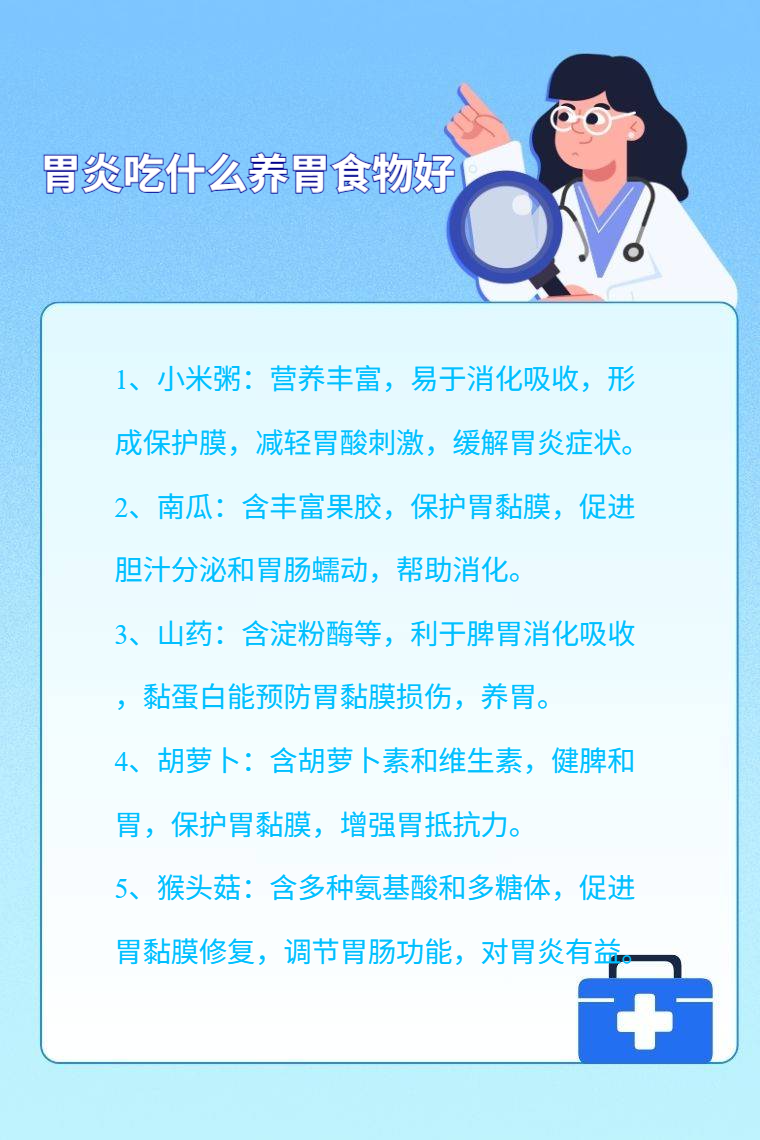 小米粥、南瓜、山药、胡萝卜、猴头菇等都是适合胃炎患者养胃的食物。