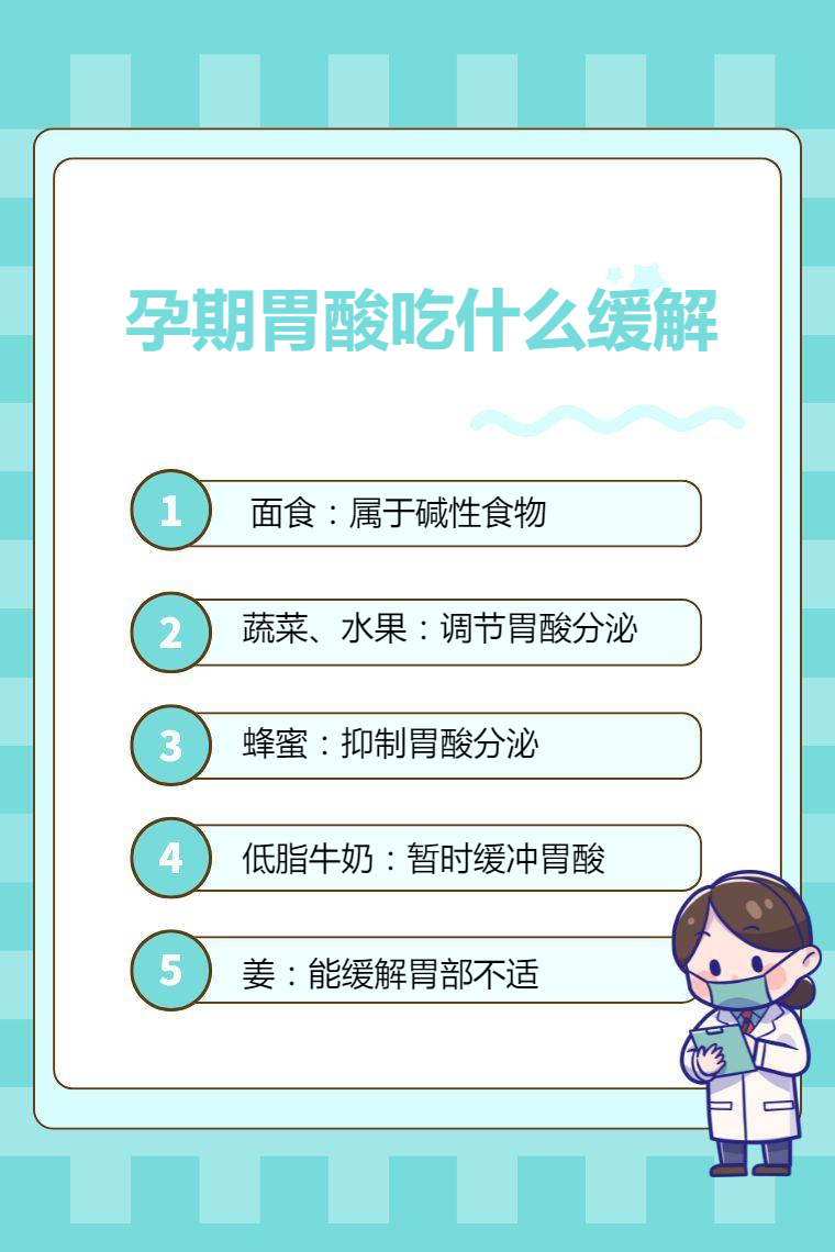 面食、蔬菜、水果、蜂蜜、低脂牛奶、姜等可缓解孕期胃酸。