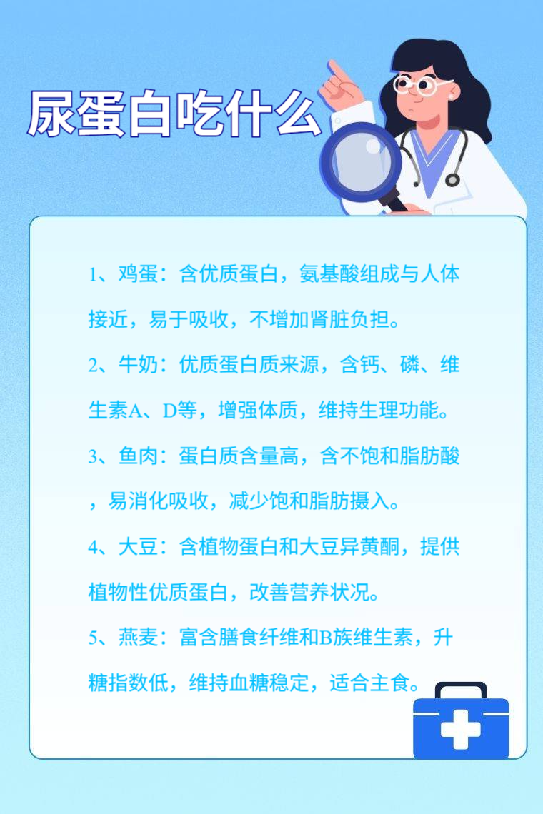 尿蛋白患者可选择鸡蛋、牛奶、鱼肉、大豆、燕麦等食物。