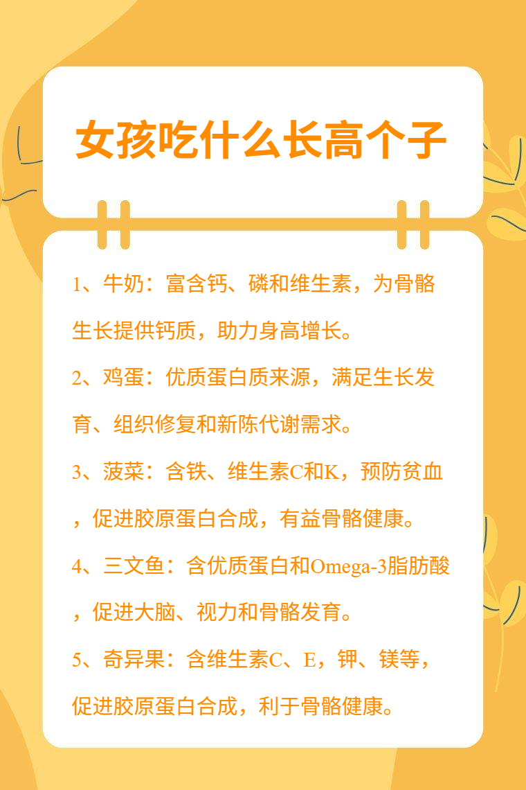 1. 牛奶:富含钙和磷等矿物质以及多种维生素,钙是骨骼生长的重要元素,能为骨骼发育提供充足的钙质原料,促进骨骼的生长和强化,每天适量饮用可助力身高增长。