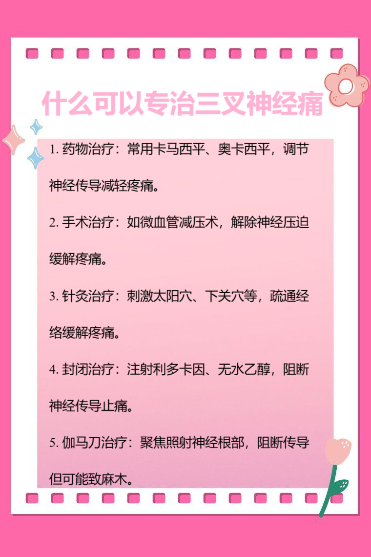 药物治疗、手术治疗、针灸治疗、封闭治疗、伽马刀治疗等可以专治三叉神经痛。