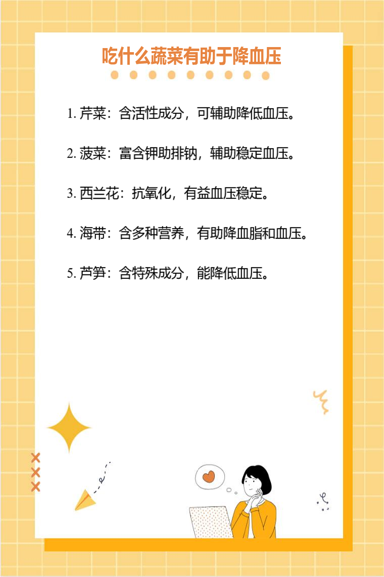 食用芹菜、菠菜、西兰花、海带、芦笋等蔬菜有助于降血压。