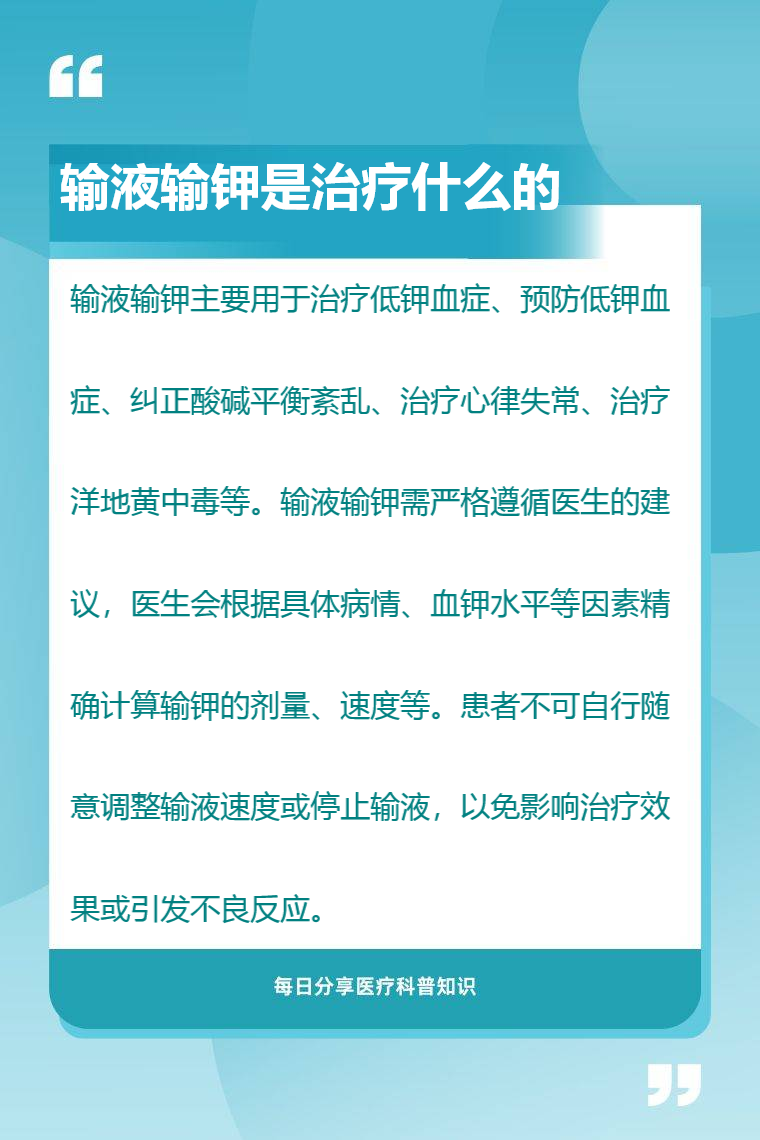 输液输钾主要用于治疗低钾血症、预防低钾血症、纠正酸碱平衡紊乱、治疗心律失常、治疗洋地黄中毒等。