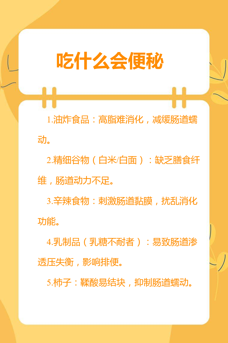吃油炸食品、精细谷物、辛辣食物、乳制品、柿子等会导致便秘。