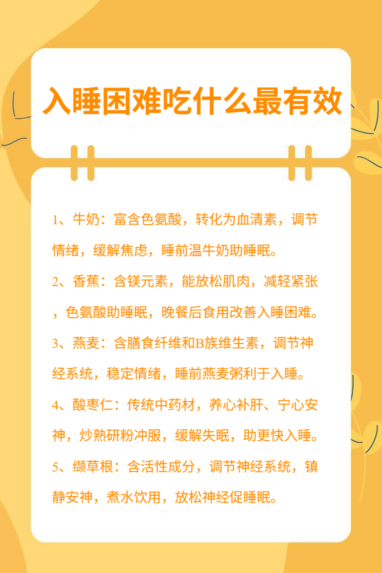 牛奶、香蕉、燕麦、酸枣仁、缬草根等对入睡困难有一定效果。
