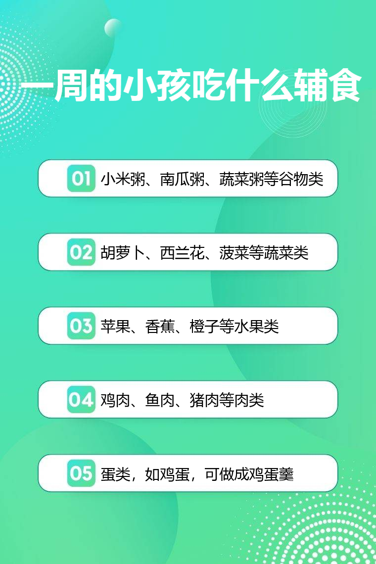 一周岁小孩可吃的辅食有谷物类、蔬菜类、水果类、肉类、蛋类等。