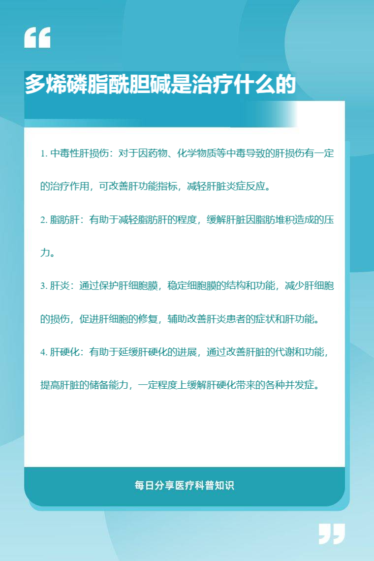 多烯磷脂酰胆碱可用于治疗中毒性肝损伤、脂肪肝、肝炎、肝硬化等。