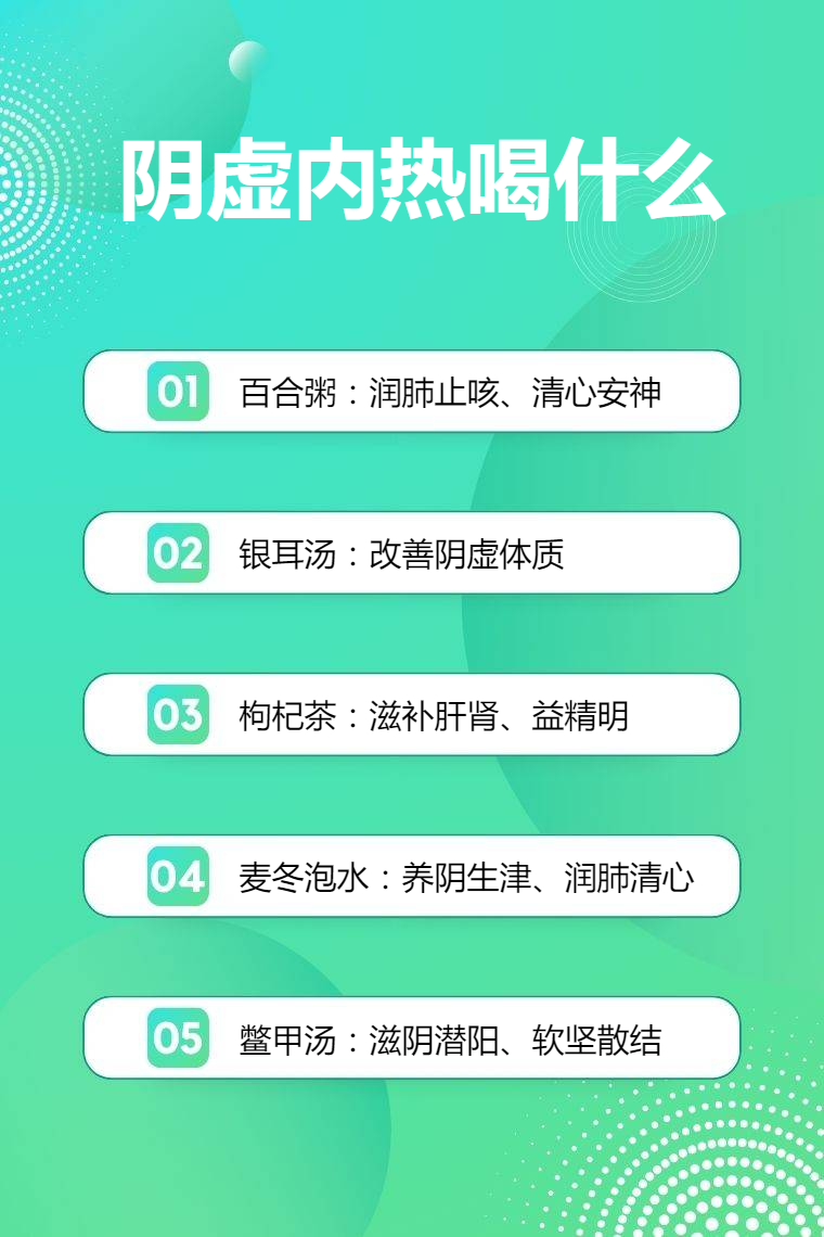 阴虚内热可喝百合粥、银耳汤、枸杞茶、麦冬泡水、鳖甲汤等。