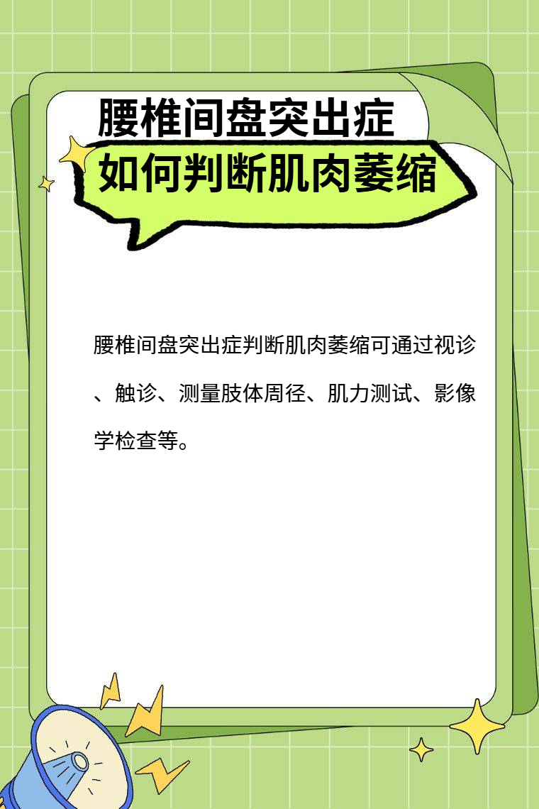 腰椎间盘突出症判断肌肉萎缩可通过视诊、触诊、测量肢体周径、肌力测试、影像学检查等。