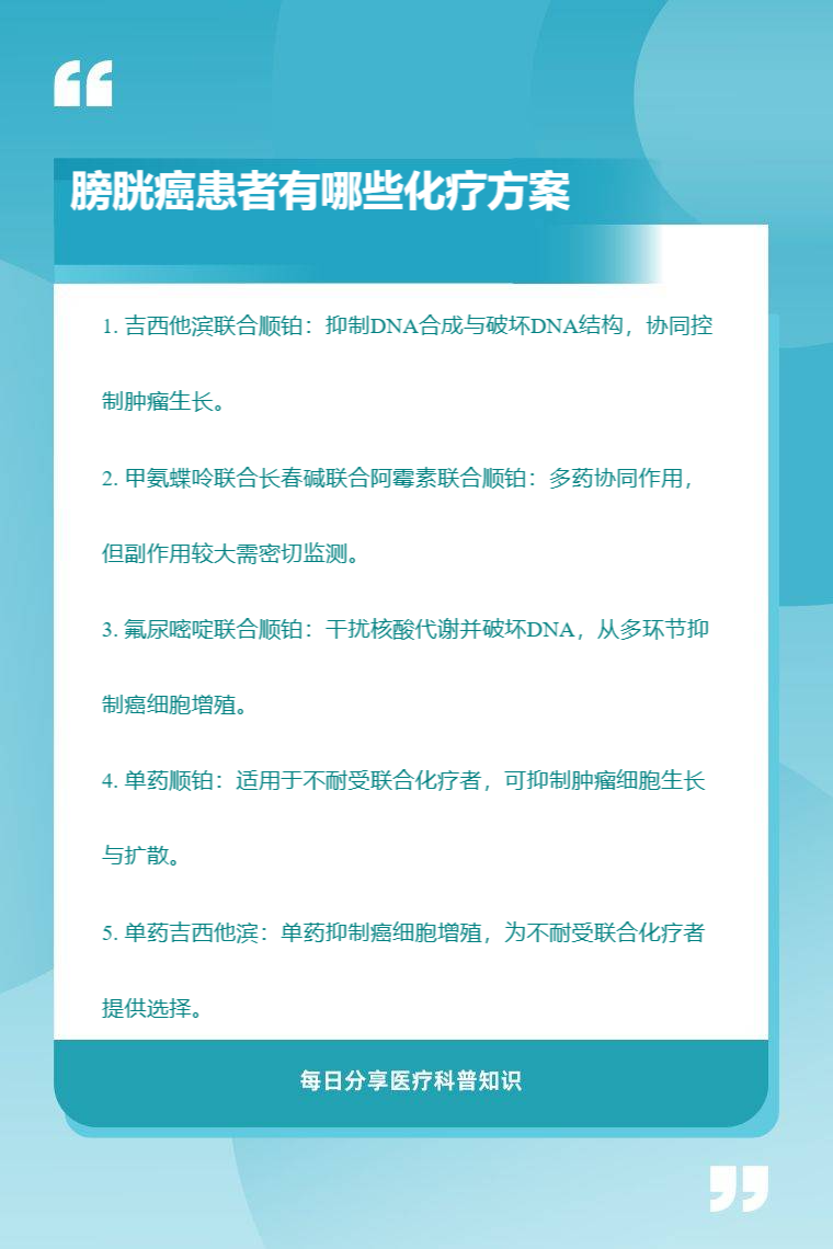 3. 氟尿嘧啶联合顺铂:氟尿嘧啶可干扰癌细胞的核酸代谢,顺铂破坏DNA,二者联合能从不同环节抑制癌细胞,对膀胱癌有一定治疗作用,可用于部分膀胱癌患者的治疗。