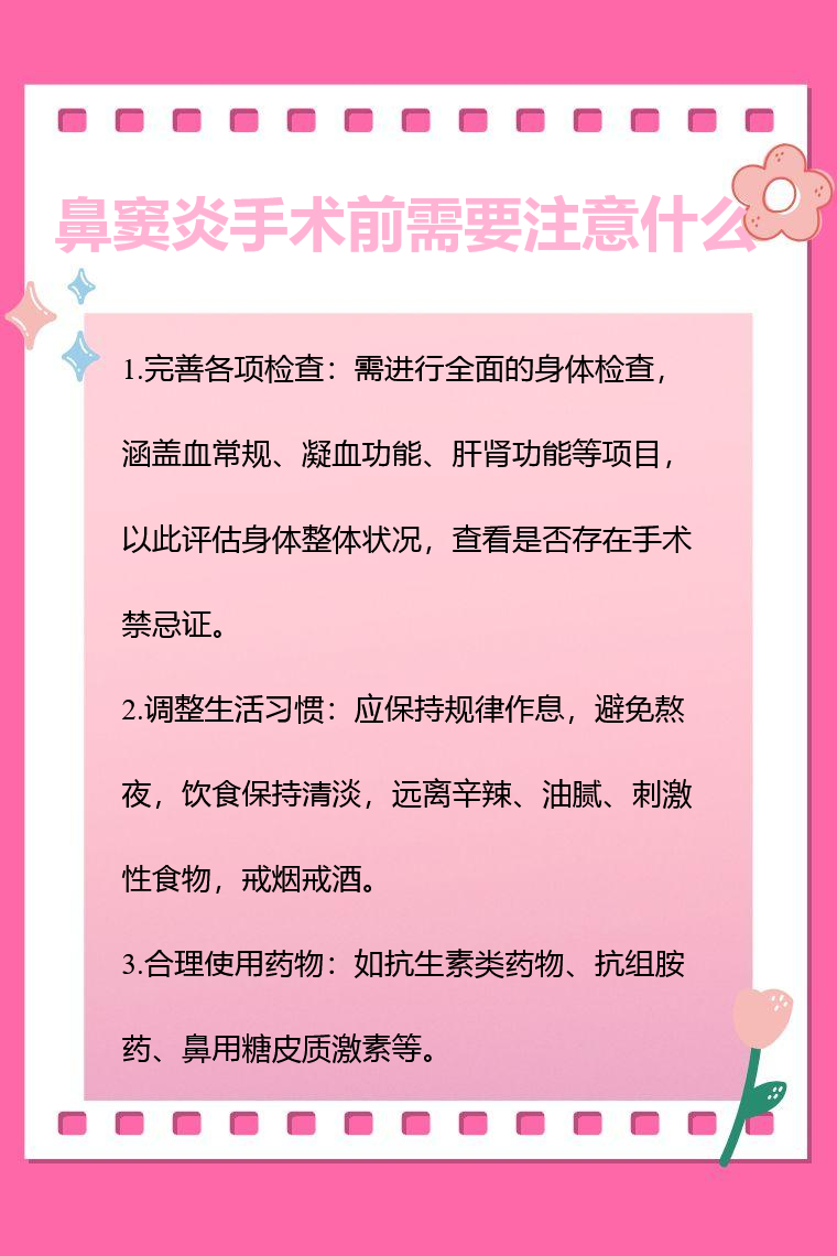 鼻窦炎手术前需要注意完善各项检查、调整生活习惯、合理使用药物等。
