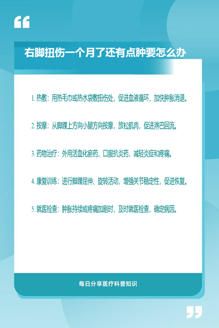 右脚扭伤一个月仍有点肿可通过热敷、按摩、药物治疗、康复训练、就医检查等。
