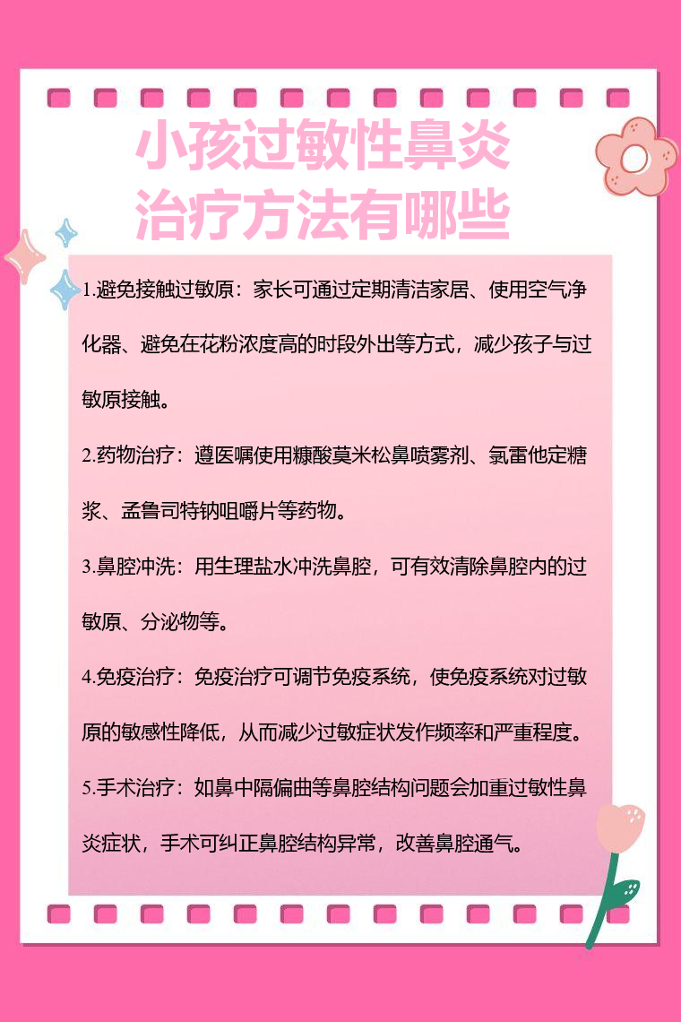 小孩过敏性鼻炎的治疗方法有避免接触过敏原、药物治疗、鼻腔冲洗、免疫治疗、手术治疗等。