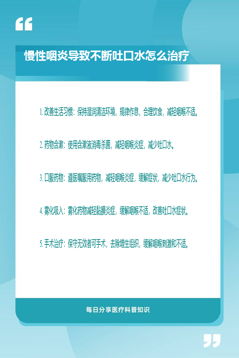 慢性咽炎导致不断吐口水可通过改善生活习惯、药物含漱、口服药物、雾化吸入、手术治疗等方法来缓解。