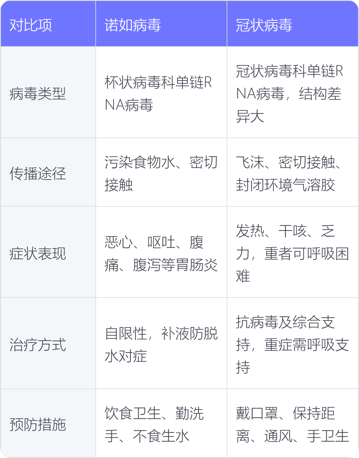 诺如病毒与冠状病毒在病毒类型、传播途径、症状表现、治疗方式、预防措施等方面存在不同。