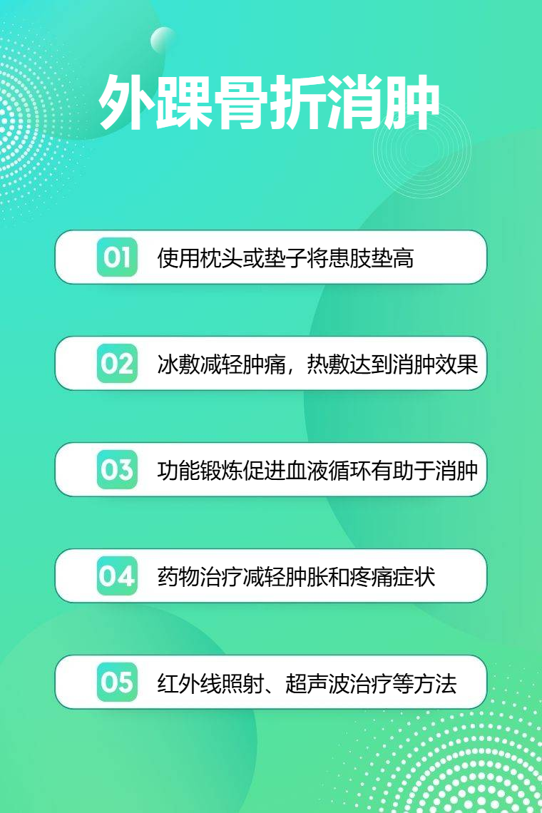 外踝骨折消肿方法有抬高患肢、冰敷热敷、功能锻炼、药物治疗、物理治疗等。