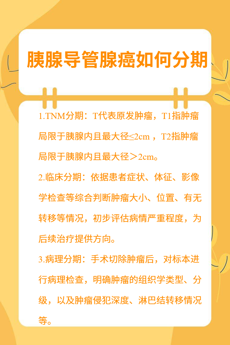 1.TNM分期:T代表原发肿瘤,T1指肿瘤局限于胰腺内且最大径≤2cm ,T2指肿瘤局限于胰腺内且最大径>2cm ,T3指肿瘤侵犯至胰腺外但未累及腹腔干和肠系膜上动脉,T4指肿瘤侵犯腹腔干和肠系膜上动脉。N代表区域淋巴结,N0表示无区域淋巴结转移,N1表示有区域淋巴结转移 。M代表远处转移,M0无远处转移,M1有远处转移。