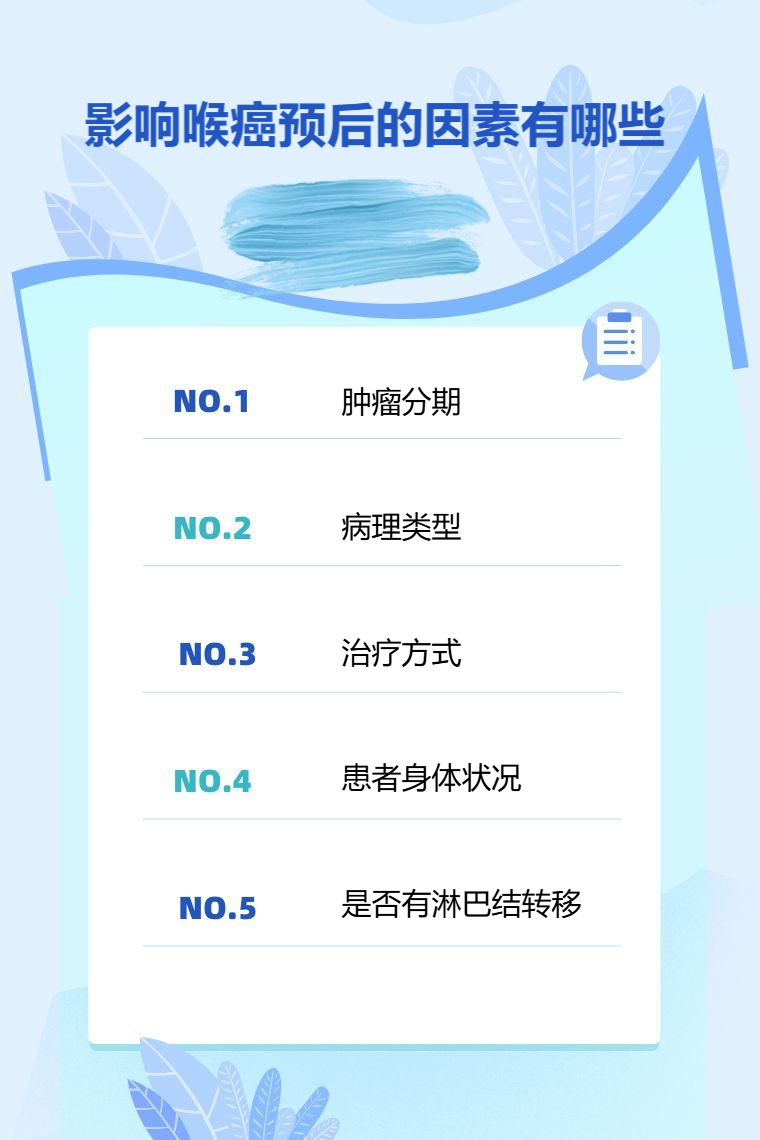 1. 肿瘤分期:肿瘤发现越早、分期越靠前,病变范围局限,手术完整切除肿瘤的可能性越大,预后相对越好;而晚期喉癌常侵犯周围重要结构,出现远处转移,治疗难度大,预后较差。