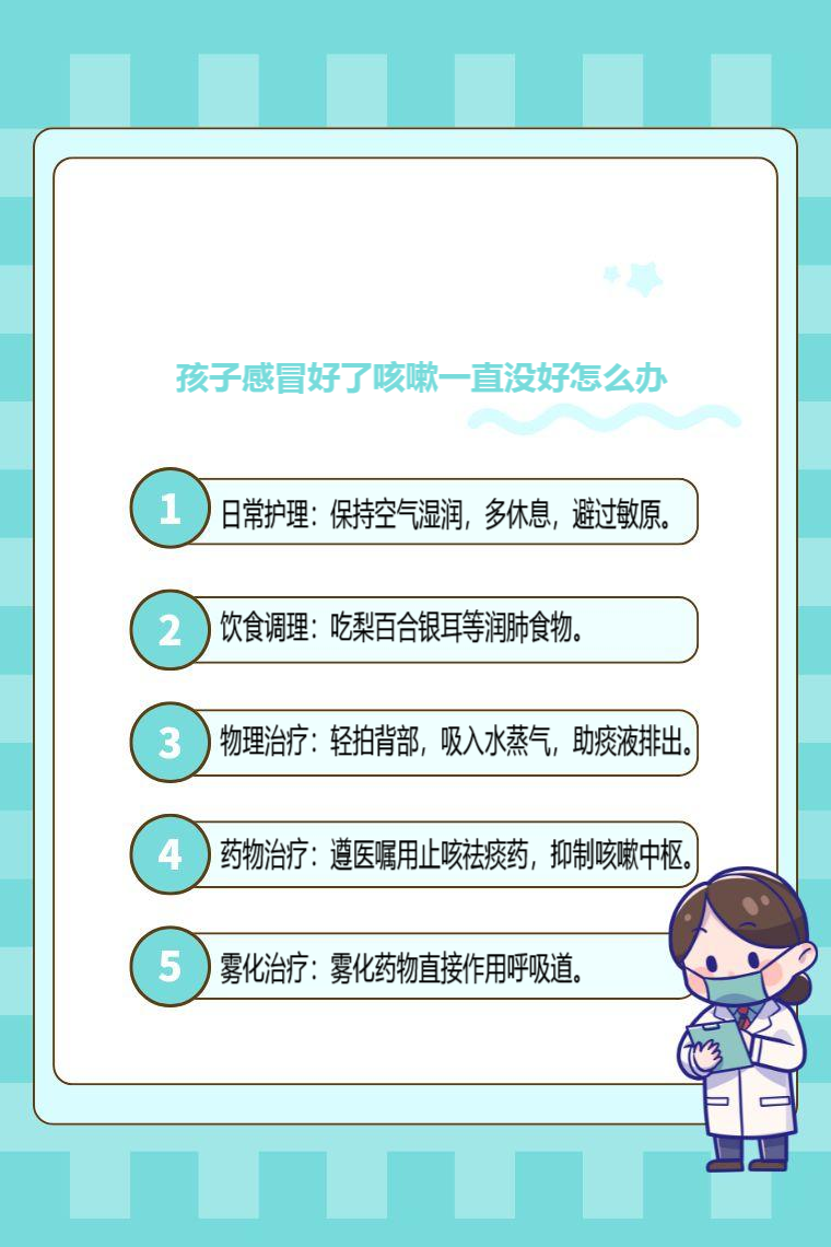 孩子感冒好了咳嗽一直没好可通过日常护理、饮食调理、物理治疗、药物治疗、雾化治疗等方法来缓解。