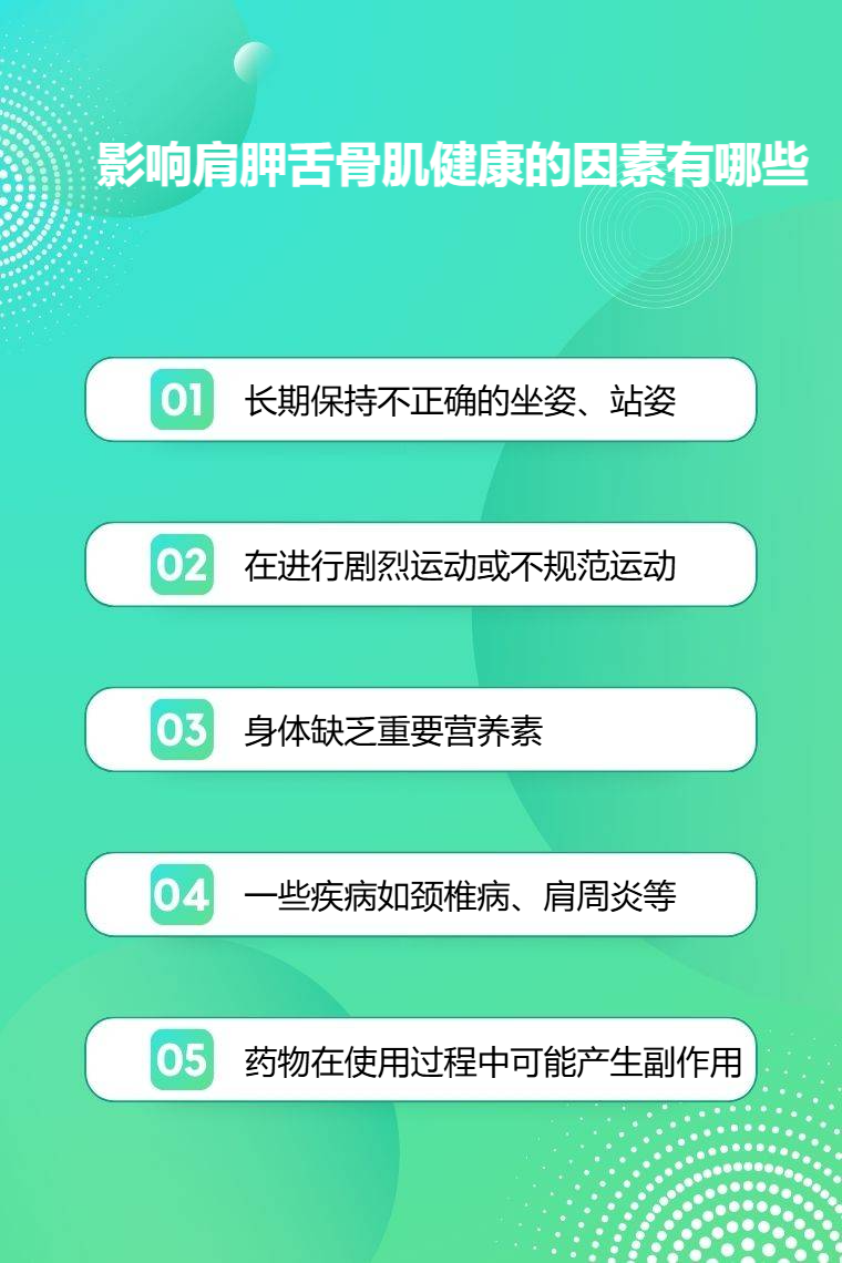 不良姿势、运动损伤、营养缺乏、疾病因素、药物副作用等影响肩胛舌骨肌健康。