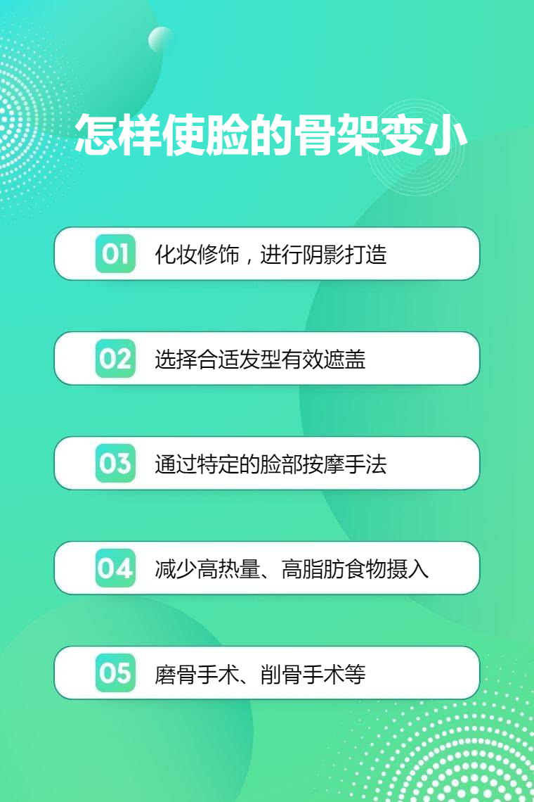 5. 医美手术:磨骨手术、削骨手术等医美手段能直接改变脸部骨骼结构,达到使脸骨架变小的效果,但此类手术风险较高,需选择正规医疗机构和有经验的医生进行操作。